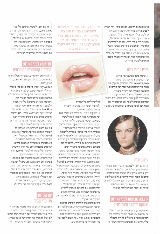 ד"ר אברי רווה: "זה יעניק לפנים מראה צעיר יותר: שחזור והגדרת קו לסת, מילוי סנטר נסוג, מילוי שקעים באישור הרקות והגבהת עצמות הלחיים. במצבים מסויימים אפשר לפסל ולתקן את האף באמצעות חומצה היאלורונית כמו למדל אף גבנוני או נפול". זמן החלמה קצר, מחזיק מעמד כשנה והחזרה לשגרה מיידית.